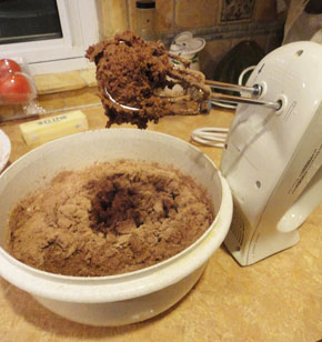 Can you find everything I’m about to listed here in the photo to the left? Butter (softened), sugar, eggs, vanilla, coconut flour, unsweeteded cocoa powder, baking soda, baking powder, salt, and milk. Such good ingredients.