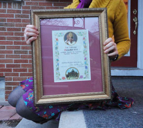 A few weeks later I received a letter in the mail…from the VATICAN. No joke. It wasn’t from the Holy Father, but it was from his secretary. The letter thanked me for the card, assured me of the Holy Father’s prayers (WHAT NOW) and included a prayer card with the Holy Father’s image upon it. I hung it in our kitchen. I think it’s still there. 🙂