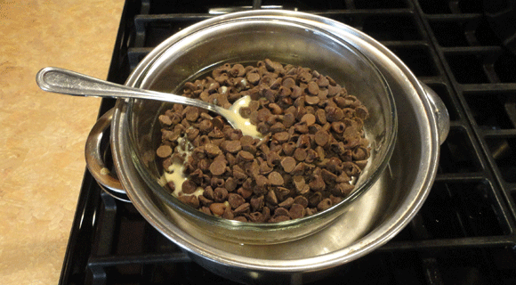 Melt them in a double-boiler. Or, if you don’t have a double boiler, concoct one using a pot and a bowl.