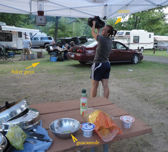 We arrived on Friday, after having gotten ourselves lost not once but twice. We being my sister and I. We drove into the campsites in her car, scanning for our spot. There were a half-dozen biker guys complete with facial hair, cut-off sleeves and a roaring fire…in our campsite.