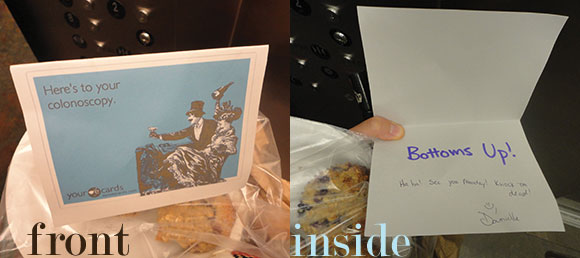 Inside: “Bottoms Up! Ha ha! See you Monday! Knock ’em dead!”