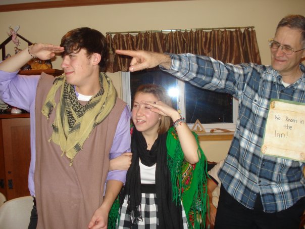 St. Mary and St. Joseph kicked out of the inn! Looking for a good place to have beebee Jesus! This is Josh and Julia when they were babies…but they still kind of are, so here they’re prenatal.