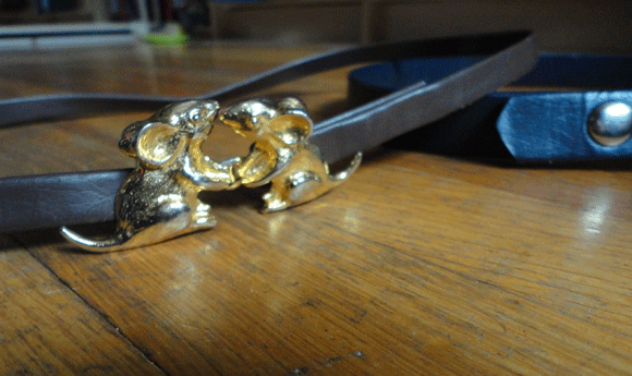 And the belts. One I found, navy with a cool buckle that’s really a ring. The other has mice detailing. It buckles when they hold paw-hands! It looks like they’re cuddling!