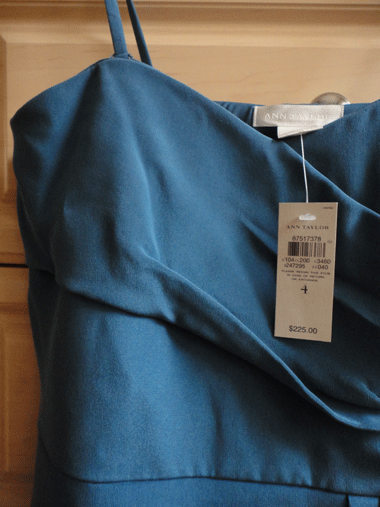 This dress, again. So you could see that the tags are STILL ON IT. For TWO HUNDRED TWENTY-FIVE DOLLAHS. Not 100% my style, but 100% the color of my eyes and 100% only SIXTEEN DOLLARS and the lady asked, “Do you have any formal events” and I replied, “I pretty much go to weddings all the time.”