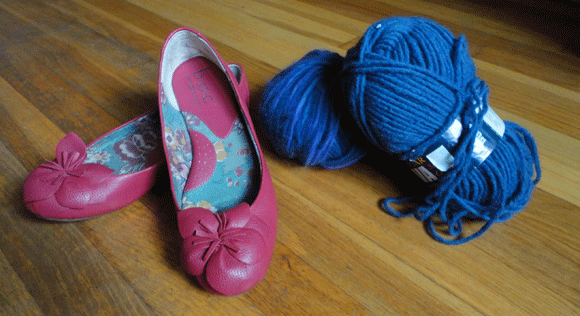 Dear pink, leather flats with what I imagine to be a mock tropical rain-flower on the toe and my yarn.