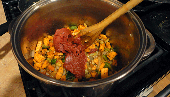 | 1 Onion 1 Sweet Potato 5 cloves of garlic 1 Green Pepper 1 Carrot 1 Stalk of Celery 1 Tablespoon Oil 1 6-oz. can of tomato paste 1 Tbsp. Chili Powder 1 Tbsp. Cumin 1 tsp. Oregano |