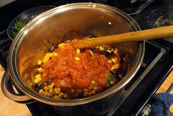 Here’s where we get creative. The original recipe called for a can of black beans. Since I permanently reside on the edge, I added two, plus a can of corn plus a can of “chili-ready tomatoes,” just for good measure.