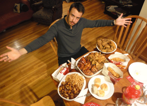 Lies re: photos. Here’s a gorgeous picture of Josh eating fried chicken. He does this every year for his birthday (past, what, three years now?)