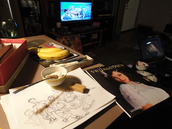 In above-photo: Hitchcock on the screen, wedding magazine for one of Lauren’s friends, picture for Lauren, ice cream for me.