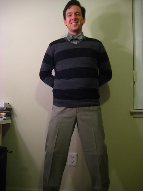 So what we’ve got here is a grey diamond herringbone bowtie on grey herringbone straight collar (not English collar, that’s too wide), with a black and grey stripe sweater to link the grey’s with the black shoes and belt. From far away, it looks like a grey on grey ensemble, but zoom in and hey: pattern!