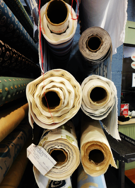 And while I didn’t find anything I loved, I did touch plenty of rich fabrics and that was a good thing. There was a pile of heavy cottons printed with faux-vintage images: school buses and rotary phones and Warhol-like faces. There was a little boy playing with the kitchen-set they had set up. His mother spoke to him softly with a British accent, and his little voice had a touch of accent, too, “Look, mom, I just put cookies in the oven!” (“Cool,” she responded).