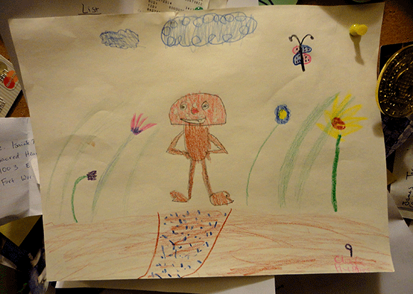 “Mushroom Man” by my super cool youngest cousin, le artist. Is this not the happiest picture? I adore his tooth. And his pose. And the flowers and the butterfly.