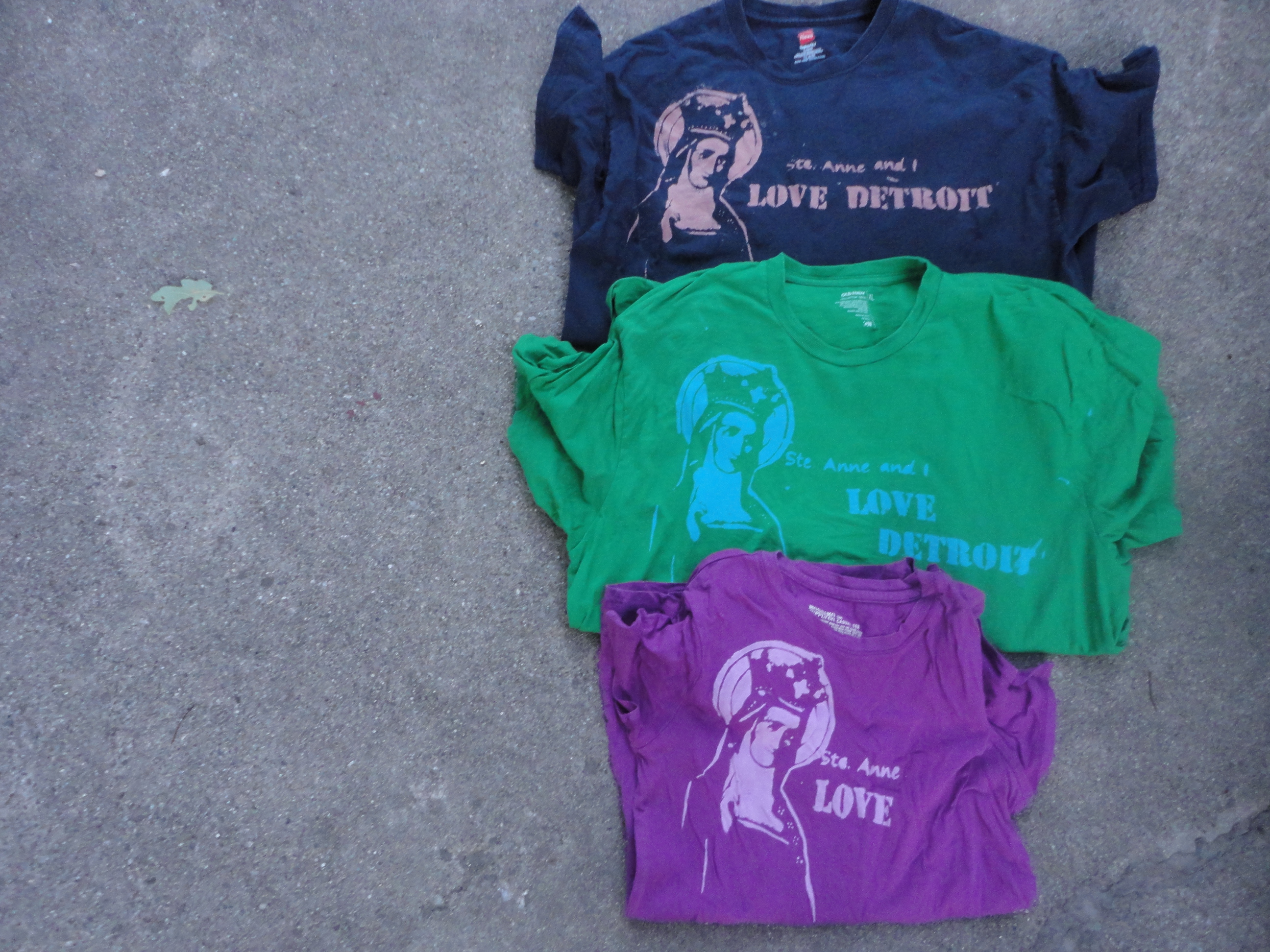 I’ve created a sweatshop in my backyard. Kidding. But I have busted butt the past few days cranking these suckers out. I’ve used a method called “discharge dying” where you essentially use bleach or something like bleach to lift the dye from the material, producing a design that is darker than the rest of the shirt.