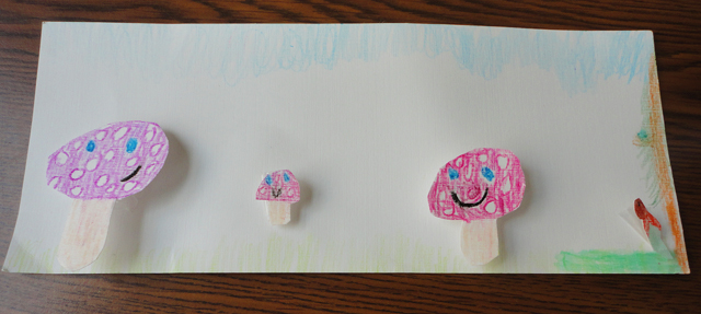 This, my friends, is 3-D pop up art–propped up by meticulously rolled pieces of scotch tape. We’ve got a happy mushroom family, accompanied by “their friend the worm.”