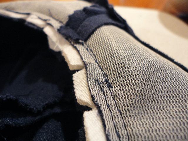 The photo above is a shot of interfacing, which is kind of a structural part of garment construction. You shouldn’t see it in the end, so maybe some of you have never seen the pattern of interfacing-against-material. I liked the contrast of the white of the facing against the navy material, the intricate weave against the chunky-cut seam. Mmmmmmmmm.