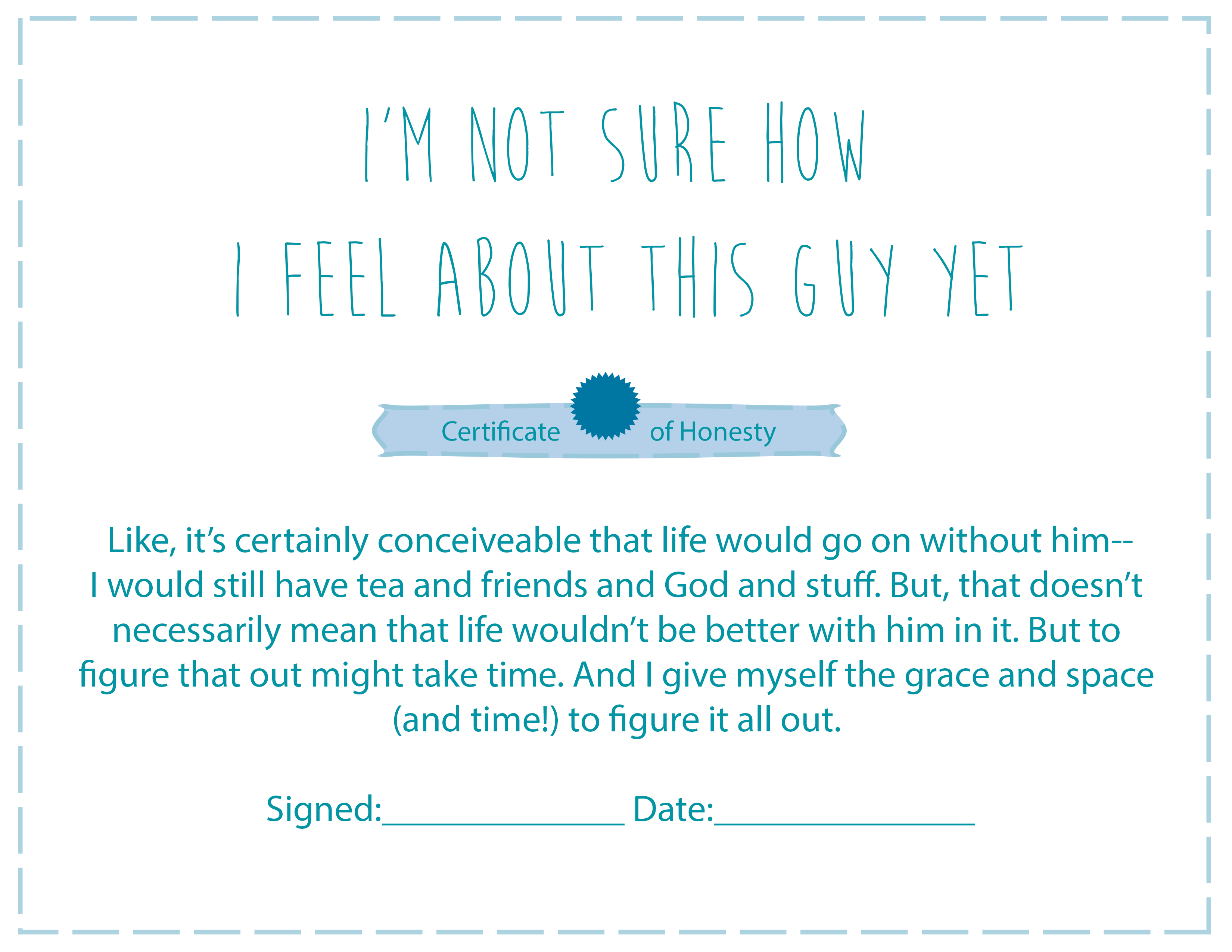Love this, truly. The certificates are legit. The honest navigation of this whole process is refreshingly void of preachiness and formulas. Because it comes down to two people trying to seek God’s will, and the Bible has lots of different examples of that.