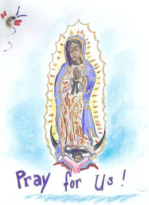Our Lady of Guadalupe…with noodle detailing in the corner, there. This one utilized paint as a medium, and a gold paint outlines much of the work. This was masterfully done by my cousin, Johanna, who has a side hobby creating icons!